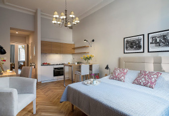 Przestronne Apartamenty typu Studio Superior o powierzchni od 28 do 42 m kwadratowych składają się z: części wypoczynkowej z rozkładaną sofą (w niektórych apartamentach), fotelem lub fotelami i płaskim telewizorem LCD, części sypialnianej z łożem małżeńskim lub łóżkami pojedynczymi, świetnie wyposażonym aneksem kuchennym oraz łazienki z prysznicem i WC.